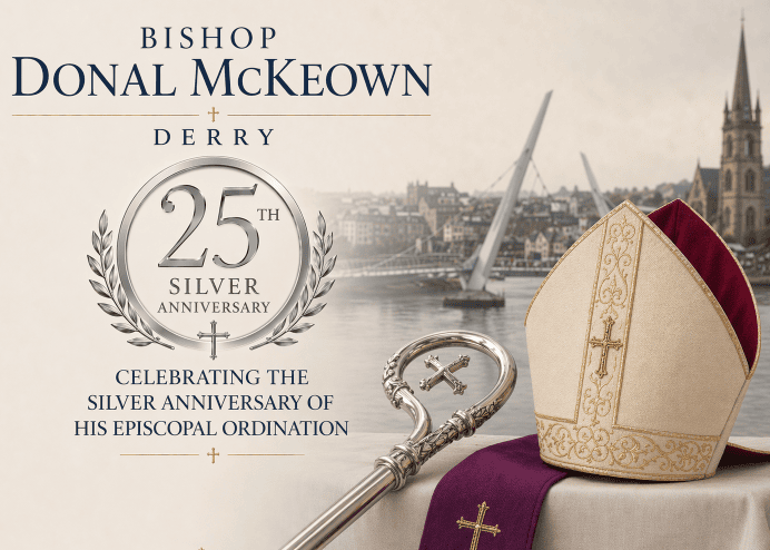 Silver Anniversary of the Episcopal Ordination of Bishop McKeown A Mass of thanksgiving will be celebrated on Sunday, 26th April at 3.00pm in St Eugene’s Cathedral to celebrate the occasion. Anyone wishing to attend would be most welcome.
